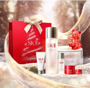 2025年 数量限定 SK-IIクリスマスコフレ。広がるクリアな素肌の贈り物。SK-IIの「ぴてくま」と一緒に素敵なクリスマスを過ごそう。