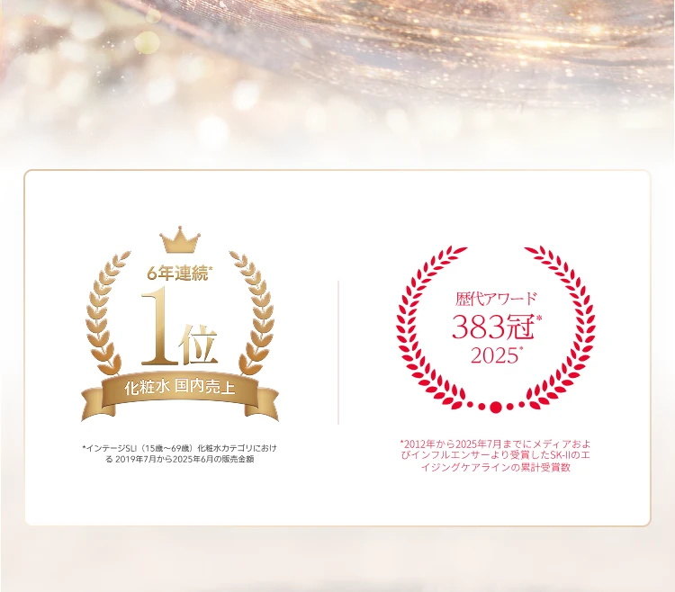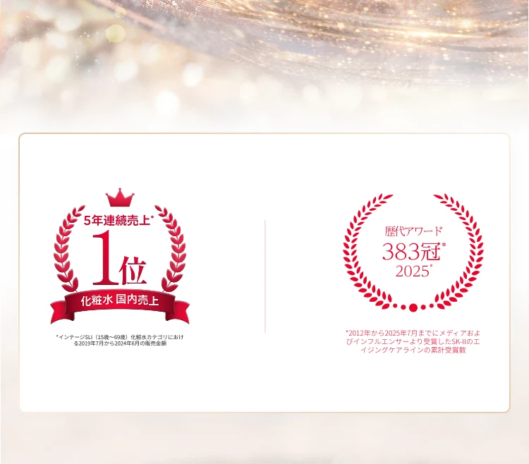 - 2024年の日本国内におけるSK-IIの化粧水・エイジングケアクリーム・ブライトニング美容液の各カテゴリ内での売上数量No.1商品(ただし、ジェノプティクス インフィニット エッセンスについては製品リニューアル前のジェノプティクス ウルトオーラ エッセンスの売上実績に基づき、スキンパワー リニュー クリームについては製品リニューアル前のスキンパワー アドバンスト クリームの売上実績に基づく)。